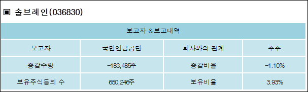 솔브레인(036830)은 05일 주주 국민연금공단을 비롯한 특별관계자의 보유주식이 감소되었다고 발표했다. 이는 직전 보고일보다 183,485주 감소하여 지분율은 3.93%로 하락했다. 이번 보고 사유는 단순추가취득/처분으로 알려졌다.