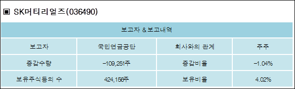 SK머티리얼즈(036490)는 05일 주주 국민연금공단을 비롯한 특별관계자의 보유주식이 감소되었다고 발표했다. 이는 직전 보고일보다 109,251주 감소하여 지분율은 4.02%로 하락했다. 이번 보고 사유는 단순추가취득/처분으로 알려졌다.