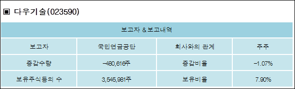 다우기술(023590)은 05일 주주 국민연금공단을 비롯한 특별관계자의 보유주식이 감소되었다고 발표했다. 이는 직전 보고일보다 480,616주 감소하여 지분율은 7.9%로 하락했다. 이번 보고 사유는 단순추가취득/처분으로 알려졌다.