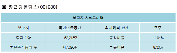 종근당홀딩스(001630)는 05일 주주 국민연금공단을 비롯한 특별관계자의 보유주식이 감소되었다고 발표했다. 이는 직전 보고일보다 52,213주 감소하여 지분율은 8.33%로 하락했다. 이번 보고 사유는 단순추가취득/처분으로 알려졌다.