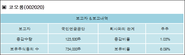 코오롱(002020)은 05일 주주 국민연금공단을 비롯한 특별관계자의 보유주식이 증가되었다고 발표했다. 이는 직전 보고일보다 123,530주 증가하여 지분율은 6.09%로 상승했다. 이번 보고 사유는 단순추가취득/처분으로 알려졌다.