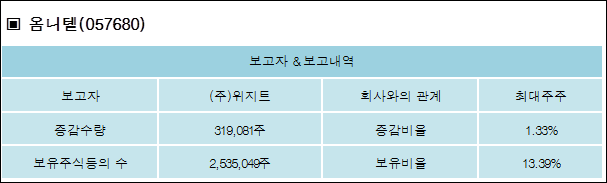 옴니텔(057680)은 05일 최대주주 (주)위지트의 보유주식이 증가되었다고 발표했다. 이는 직전 보고일보다 319,081주 증가하여 지분율은 13.39%로 상승했다. 이번 보고 사유는 제5회차CB양수도(제3자)계약체결으로 알려졌다.