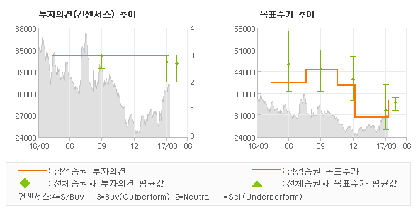 | 의견제시일자 | 증권사 | 투자의견 | 목표가 | | 20170406 | 삼성증권 | 매수 | 35,000 | | 20170405 | 하이투자증권 | 매수(유지) | 36,000 | | 20170403 | KTB투자증권 | HOLD | 32,000 | | 20170314 | 이베스트투자증권 | HOLD(신규) | 26,500 |