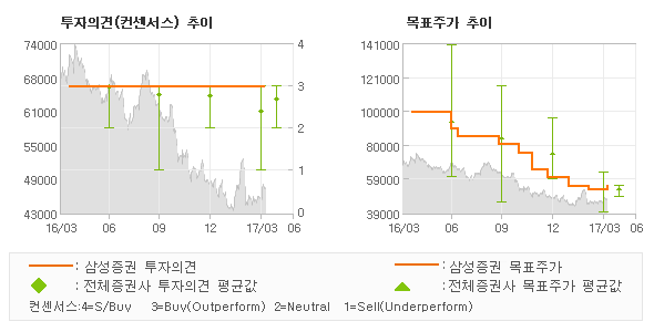 | 의견제시일자 | 증권사 | 투자의견 | 목표가 | | 20170406 | 삼성증권 | 매수 | 55,000 | | 20170406 | 한국투자증권 | 매수(유지) | 53,000 | | 20170405 | 대신증권 | MARKETPERFORM(유지) | 48,000 | | 20170306 | 하이투자증권 | HOLD | 40,000 |