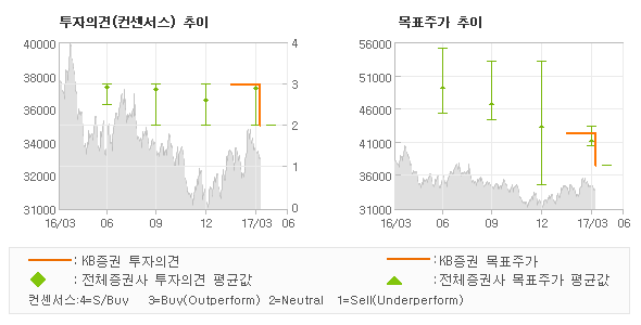 | 의견제시일자 | 증권사 | 투자의견 | 목표가 | | 20170406 | KB증권 | HOLD(하향) | 37,000 | | 20170328 | 한국투자증권 | 매수(분석재개) | 43,000 | | 20170321 | IBK투자증권 | 매수 | 43,000 | | 20170313 | KTB투자증권 | 매수 | 40,000 |