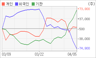 | 기관/개인 순매수, 외국인은 순매도(한달누적) 기관이 4일연속 순매수를 보이고 있는 반면에 외국인은 2일연속 순매도를 보이고 있다. 4주간을 기준으로 보면 기관이 순매도를 기록하다가 다시 순매수로 돌아서면서 68,814주를 순매수했고, 개인들도 매수반전의 모습을 보이며 6,024주를 순매수했다. 반면 그 동안 외국인은 순매도로 돌아서면서 74,838주를 순매도했다. |