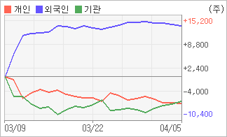 | 기관과 개인은 순매도, 외국인은 순매수(한달누적) 기관이 4일연속 순매수를 보이고 있는 반면에 외국인은 2일연속 순매도를 보이고 있다. 4주간을 기준으로 보면 외국인이 초반에 동종목을 순매수한 이후에 기세를 이어가며 13,877주를 순매수한 반면, 기관은 매도 관점으로 접근하면서 6,583주를 순매도했고, 개인들도 매도쪽으로 방향을 잡으면서 7,294주를 순매도한 것으로 집계됐다. |