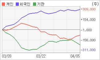 | 기관과 개인은 순매도, 외국인은 순매수(한달누적) 4월4일부터 전일까지 기관이 2거래일 연속 순매도를 보였다. 4주간을 기준으로 보면 외국인이 초반에 동종목을 순매수한 이후에 기세를 이어가며 308,228주를 순매수한 반면, 기관은 매도 우위를 보이면서 225,028주를 순매도했고, 개인들도 매도쪽으로 방향을 잡으면서 83,200주를 순매도한 것으로 집계됐다. |