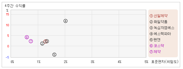 | 위험대비 수익률 1.8로 상위권, 업종평균대비 성과 좋지 않아 7일 오전 9시40분 현재 전일대비 1.49% 오른 13,600원을 기록하고 있는 신일제약은 지난 1개월간 2.26% 상승했다. 동기간 동안에 변동성을 나타내는 지표인 표준편차는 1.2%를 기록했다. 이는 제약 업종내에서 주요종목들과 비교해볼 때 신일제약의 월간 주가수익률은 적정한 수준에 있었지만 변동성은 상대적으로 낮은 수준을 유지했다는 뜻이다. 최근 1개월을 기준으로 신일제약의 위험을 고려한 수익률은 1.8을 기록했는데, 변동성이 낮은 상태에서 주가흐름은 양호했기 때문에 위험대비 수익률은 높은 수준을 유지했다. 다만 제약업종의 위험대비수익률 3.4보다는 낮았기 때문에 업종대비 성과는 뛰어났다고 할 수 없다. 다음으로 업종과 시장을 비교해보면 신일제약이 속해 있는 제약업종은 코스닥지수보다 변동성은 높고, 수익률은 낮은 모습을 보여주고 있다. 다시 말해서 동업종은 지수보다 크게 오르락 내리락 했지만, 상승률은 오히려 지수보다 못하다는 의미이다. |