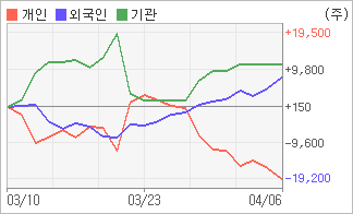 | 외국인/기관 순매수, 개인은 순매도(한달누적) 4월5일부터 전일까지 외국인이 2거래일 연속 순매수를 보였다. 4주간을 기준으로 보면 외국인이 매매관점을 매도에서 매수로 전환하면서 7,784주를 순매수했고, 기관도 방향성있는 매매를 하면서 11,368주를 순매수했다. 반면 개인들은 매도 우위로 반전되면서 19,152주를 순매도한 것으로 나타났다. |