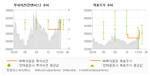 | 의견제시일자 | 증권사 | 투자의견 | 목표가 | | 20170407 | NH투자증권 | 매수(상향) | 38,000 | | 20170405 | 메리츠종금증권 | HOLD | 25,500 | | 20170405 | 하이투자증권 | 매수(유지) | 42,000 | | 20170403 | KTB투자증권 | HOLD | 34,000 |
