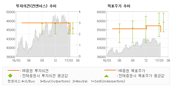| 의견제시일자 | 증권사 | 투자의견 | 목표가 | | 20170410 | KB증권 | HOLD(하향) | 53,000 | | 20170403 | 신한금융투자 | 매수 | 65,000 | | 20170315 | NH투자증권 | 매수(유지) | 58,000 | | 20170313 | 유진투자증권 | 매수(유지) | 63,000 |
