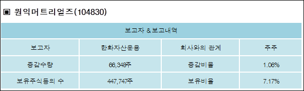 원익머트리얼즈(104830)는 10일 주주 한화자산운용을 비롯한 특별관계자의 보유주식이 증가되었다고 발표했다. 이는 직전 보고일보다 66,348주 증가하여 지분율은 7.17%로 상승했다. 이번 보고 사유는 단순추가취득/처분,실물입출고로 알려졌다.