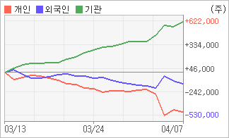 4월6일부터 전일까지 외국인이 2거래일 연속 순매도했다. 4주간을 기준으로 보면 기관이 방향성있는 매매를 하면서 621,630주를 순매수한 반면, 외국인은 매도 우위를 지속하면서 136,021주를 순매도했고, 개인들도 매도쪽으로 방향을 잡으면서 485,609주를 순매도했다.