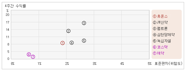 | 업종평균에 비해서 변동성 대비 성과가 좋아 10일 오전 11시20분 현재 전일대비 2.63% 하락하면서 51,800원을 기록하고 있는 휴온스는 지난 1개월간 7.14% 상승했다. 동기간 동안에 변동성을 나타내는 지표인 표준편차는 1.8%를 기록했다. 이는 제약 업종내에서 주요종목들과 비교해볼 때 휴온스의 월간 변동성이 가장 작았던 만큼 주가상승률도 주요종목군 내에서 가장 낮았다는 것을 의미한다. 최근 1개월을 기준으로 휴온스의 위험을 고려한 수익률은 3.9를 기록했는데, 변동성은 가장 낮았으나 주가상승률이 높지 않았기 때문에 위험대비 수익률은 저조한 모습을 나타냈다. 그럼에도 제약업종의 위험대비수익률 0.8보다는 높았기 때문에 업종대비 성과는 긍정적이라고 할 수 있다. 다음으로 업종과 시장을 비교해보면 휴온스가 속해 있는 제약업종은 코스닥지수보다 변동성은 높고, 수익률은 낮은 모습을 보여주고 있다. 다시 말해서 동업종은 지수보다 크게 오르락 내리락 했지만, 상승률은 오히려 지수보다 못하다는 의미이다. |