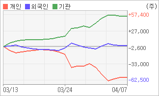 | 외국인/기관 순매수, 개인은 순매도(한달누적) 4월5일부터 전일까지 기관이 3거래일 연속 순매도를 보였다. 4주간을 기준으로 보면 외국인이 매수 우위를 유지하면서 1,752주를 순매수했고, 기관도 방향성있는 매매를 하면서 54,742주를 순매수했다. 반면 개인들은 매도쪽으로 방향을 잡으면서 56,494주를 순매도한 것으로 나타났다. |
