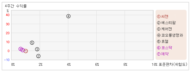| 위험대비수익률 -0.4로 하위권, 업종지수보다 낮아 10일 오전 11시25분 현재 전일대비 1.62% 하락하면서 33,450원을 기록하고 있는 씨젠은 지난 1개월간 0.45% 하락했다. 같은 기간동안에 위험를 나타내는 지표인 표준편차는 1%를 기록했다. 이는 제약 업종내에서 주요종목들과 비교해볼 때 씨젠의 월간 변동성이 가장 작았던 만큼 주가하락률도 주요종목군 내에서 상대적으로 낮았다는 것을 의미한다. 최근 1개월을 기준으로 씨젠의 위험을 고려한 수익률은 -0.4를 기록했는데, 변동성은 가장 낮았지만 주가가 하락했기 때문에 위험대비 수익률은 저조한 수준을 나타냈다. 게다가 제약업종의 위험대비수익률인 0.8보다도 낮기 때문에 업종대비 성과도 긍정적이라고 할 수 없다. 다음으로 업종과 시장을 비교해보면 씨젠이 속해 있는 제약업종은 코스닥지수보다 변동성은 높고, 수익률은 낮은 모습을 보여주고 있다. 다시 말해서 동업종은 지수보다 크게 오르락 내리락 했지만, 상승률은 오히려 지수보다 못하다는 의미이다. |