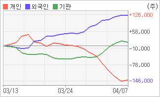 | 외국인/기관 순매수, 개인은 순매도(한달누적) 전일 외국인과 기관이 각각 22주, 4,287주를 순매수 했다. 4주간을 기준으로 보면 외국인이 초반에 동종목을 순매수한 이후에 기세를 이어가며 125,367주를 순매수했고, 기관도 순매도를 기록하다가 다시 순매수로 돌아서면서 15,363주를 순매수했다. 반면 개인들은 매도 우위로 반전되면서 140,730주를 순매도한 것으로 나타났다. |