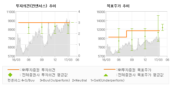 | 의견제시일자 | 증권사 | 투자의견 | 목표가 | | 20170410 | NH투자증권 | 매수(유지) | 11,500 | | 20170406 | 대신증권 | 매수(상향) | 12,000 | | 20170404 | 이베스트투자증권 | 매수(유지) | 13,000 | | 20170327 | 한양증권 | 매수(유지) | 15,000 |