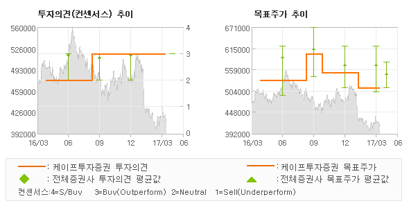 | 의견제시일자 | 증권사 | 투자의견 | 목표가 | | 20170410 | 케이프투자증권 | 매수(유지) | 510,000 | | 20170410 | IBK투자증권 | 매수(상향) | 579,000 | | 20170331 | 대신증권 | 매수(유지) | 540,000 | | 20170331 | 삼성증권 | 매수 | 530,000 |