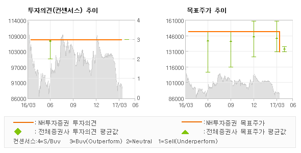 | 의견제시일자 | 증권사 | 투자의견 | 목표가 | | 20170410 | NH투자증권 | 매수(신규) | 130,000 | | 20170403 | 삼성증권 | 매수 | 135,000 | | 20170328 | 이베스트투자증권 | 매수(유지) | 160,000 | | 20170328 | 한화투자증권 | 매수(유지) | 140,000 |