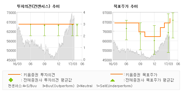 | 의견제시일자 | 투자의견 | 목표가격 | | 20170410 | 매수(유지) | 90,000 | | 20170307 | 매수(유지) | 85,000 | | 20170220 | 매수(유지) | 80,000 | | 20170208 | 매수(유지) | 80,000 | | 20170126 | 매수(유지) | 70,000 |