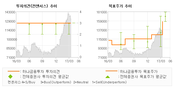 | 의견제시일자 | 증권사 | 투자의견 | 목표가 | | 20170411 | 하나금융투자 | 매수 | 157,000 | | 20170405 | IBK투자증권 | 매수(유지) | 180,000 | | 20170403 | 미래에셋대우 | 매수(유지) | 171,000 | | 20170331 | 삼성증권 | 매수 | 170,000 |