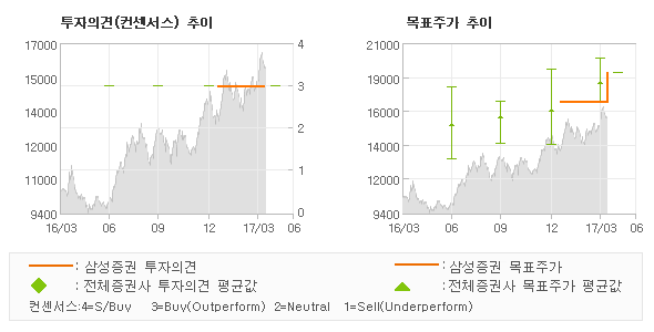 | 의견제시일자 | 증권사 | 투자의견 | 목표가 | | 20170411 | 삼성증권 | 매수 | 19,000 | | 20170328 | 교보증권 | 매수(유지) | 19,000 | | 20170316 | 한화투자증권 | 매수(유지) | 20,000 | | 20170307 | 미래에셋대우 | 매수(신규) | 18,000 |