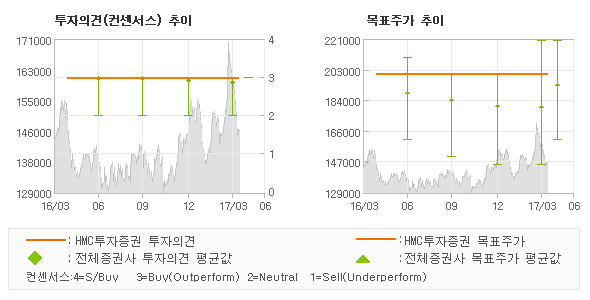 | 의견제시일자 | 증권사 | 투자의견 | 목표가 | | 20170411 | HMC투자증권 | 매수 | 200,000 | | 20170405 | 한국투자증권 | 매수 | 200,000 | | 20170405 | 하나금융투자 | 매수 | 160,000 | | 20170404 | KB증권 | 매수(신규) | 185,000 |