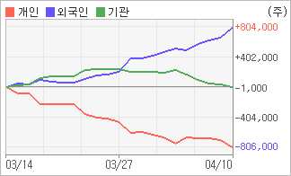 | 외국인/기관 순매수, 개인은 순매도(한달누적) 기관이 5일연속 주식을 팔고 있는 반면 외국인은 4일연속 주식을 사고 있다. 4주간을 기준으로 보면 외국인이 초반에 동종목을 순매수한 이후에 기세를 이어가며 803,785주를 순매수했고, 기관도 초반에 동종목을 순매수한 이후에 최근에는 순매수량이 줄어들고 있음에도 불구하고 2,057주를 순매수했다. 반면 개인들은 매도쪽으로 방향을 잡으면서 805,842주를 순매도한 것으로 나타났다. |