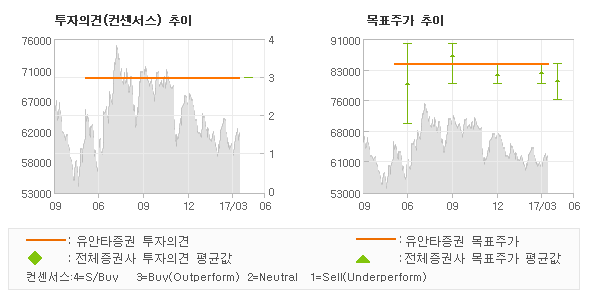 | 의견제시일자 | 증권사 | 투자의견 | 목표가 | | 20170411 | 유안타증권 | 매수(유지) | 85,000 | | 20170410 | 신한금융투자 | 매수(신규) | 76,000 |