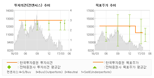 | 의견제시일자 | 증권사 | 투자의견 | 목표가 | | 20170413 | 한국투자증권 | 매수(유지) | 12,000 | | 20170412 | SK증권 | 매수(유지) | 13,000 | | 20170411 | 신한금융투자 | 매수 | 12,000 | | 20170411 | 동부증권 | HOLD | 10,000 |