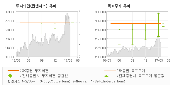 | 의견제시일자 | 증권사 | 투자의견 | 목표가 | | 20170413 | SK증권 | 매수(유지) | 300,000 | | 20170412 | 미래에셋대우 | 매수(유지) | 290,000 | | 20170405 | 메리츠종금증권 | 매수 | 300,000 | | 20170404 | 대신증권 | 매수(유지) | 310,000 |