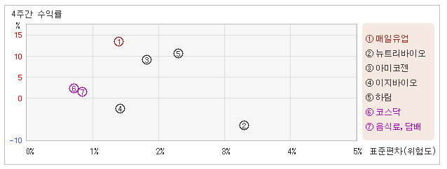 다음으로 업종과 시장을 비교해보면 매일유업이 속해 있는 음식료,담배업종은 코스닥지수보다 변동성은 높고, 수익률은 낮은 모습을 보여주고 있다. 다시 말해서 동업종은 지수보다 크게 오르락 내리락 했지만, 상승률은 오히려 지수보다 못하다는 의미이다.