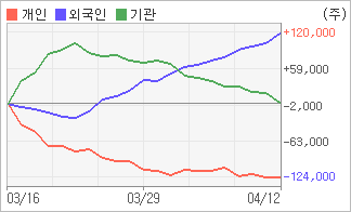 기관이 3일연속 주식을 팔고 있는 반면 외국인은 9일연속 주식을 사고 있다. 4주간을 기준으로 보면 외국인이 초반에 동종목을 순매수한 이후에 기세를 이어가며 119,265주를 순매수했고, 기관도 초반에 동종목을 순매수한 이후에 최근에는 순매수량이 줄어들고 있음에도 불구하고 2,948주를 순매수했다. 반면 개인들은 매도쪽으로 방향을 잡으면서 122,213주를 순매도한 것으로 나타났다.