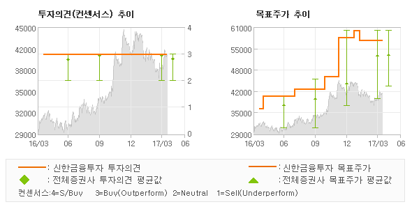 | 의견제시일자 | 증권사 | 투자의견 | 목표가 | | 20170413 | 신한금융투자 | 매수(유지) | 57,000 | | 20170412 | 하나금융투자 | NEUTRAL | 43,000 | | 20170410 | 삼성증권 | 매수 | 52,000 | | 20170407 | 대신증권 | 매수(유지) | 50,000 |