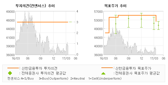 | 의견제시일자 | 증권사 | 투자의견 | 목표가 | | 20170413 | 신한금융투자 | 매수(유지) | 52,000 | | 20170411 | 한국투자증권 | 매수(유지) | 48,000 | | 20170131 | BNK투자증권 | 매수(유지) | 54,000 | | 20170125 | 키움증권 | 매수(유지) | 51,000 |