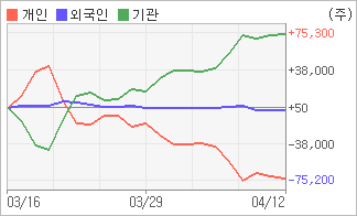 | 외국인과 개인은 순매도, 기관은 순매수(한달누적) 기관이 2일연속 순매수를 보이고 있는 반면에 외국인은 3일연속 순매도를 보이고 있다. 4주간을 기준으로 보면 기관이 방향성있는 매매를 하면서 75,255주를 순매수한 반면, 외국인은 매도 우위를 지속하면서 3,257주를 순매도했고, 개인들도 매도쪽으로 방향을 잡으면서 71,998주를 순매도했다. |