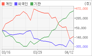 | 외국인과 개인은 순매도, 기관은 순매수(한달누적) 3월29일부터 기관이 11거래일 연속 순매수 행진을 벌이고 있다. 4주간을 기준으로 보면 기관이 순매도를 기록하다가 다시 순매수로 돌아서면서 424,724주를 순매수한 반면, 외국인은 매도 우위를 지속하면서 292,477주를 순매도했고, 개인들도 매도 우위로 반전되면서 132,247주를 순매도했다. |