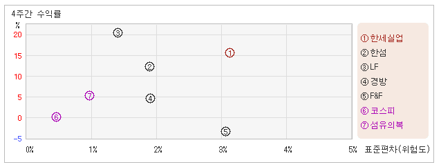 | 위험대비수익률 5.0, 업종지수보다 낮아 13일 오후 1시35분 현재 전일대비 4.9% 오른 27,850원을 기록하고 있는 한세실업은 지난 1개월간 15.8% 상승했다. 동기간 동안에 주가움직임의 위험지표인 표준편차는 3.1%를 기록했다. 이는 섬유의복 업종내에서 주요종목들과 비교해볼 때 한세실업의 월간 주가수익률이 상당히 높았던 만큼 변동성도 상대적으로 매우 높은 수준을 유지했다는 뜻이다. 최근 1개월을 기준으로 한세실업의 위험을 고려한 수익률은 5.0을 기록했는데, 변동성은 가장 높았으나 위험대비 수익률은 그렇게 높지 않다. 다만 섬유의복업종의 위험대비수익률 5.8보다는 낮았기 때문에 업종대비 성과는 긍정적으로 보기 어렵다. 다음으로 업종과 시장을 비교해보면 한세실업이 속해 있는 섬유의복업종은 코스피지수보다 변동성과 수익률이 모두 높은 모습이다. 다시 말하면 동업종에 탄력이 붙으면서 지수대비 초과상승했다는 의미이다. |