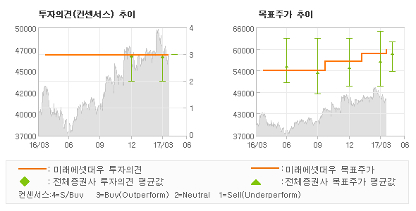 | 의견제시일자 | 증권사 | 투자의견 | 목표가 | | 20170414 | 미래에셋대우 | 매수(유지) | 60,000 | | 20170410 | 메리츠종금증권 | 매수 | 59,000 | | 20170404 | 유진투자증권 | 매수(유지) | 54,000 | | 20170403 | 키움증권 | BUY(INITIATE) | 62,000 |