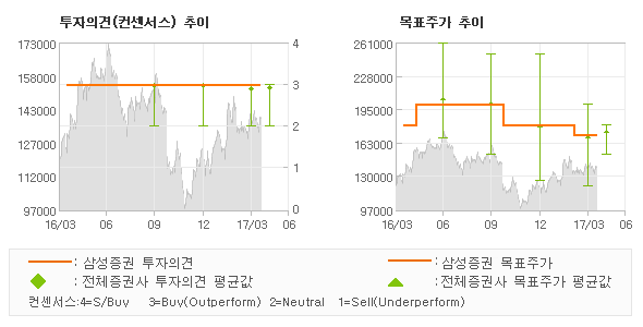 | 의견제시일자 | 증권사 | 투자의견 | 목표가 | | 20170414 | 삼성증권 | 매수 | 170,000 | | 20170412 | KB증권 | 매수(유지) | 170,000 | | 20170412 | IBK투자증권 | 매수 | 180,000 | | 20170411 | 유진투자증권 | 매수(신규) | 180,000 |