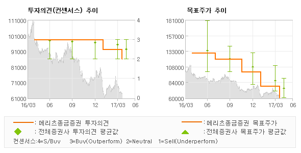 | 의견제시일자 | 투자의견 | 목표가격 | | 20170414 | HOLD | 60,000 | | 20170131 | TRADING BUY | 78,000 | | 20161116 | 매수 | 100,000 | | 20161028 | 매수 | 120,000 | | 20161005 | 매수 | 120,000 |