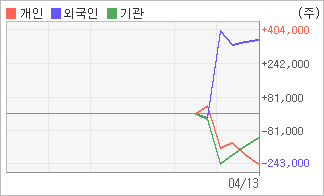 | 기관과 개인은 순매도, 외국인은 순매수(한달누적) 4월12일부터 전일까지 기관이 2거래일 연속 순매수했다. 4주간을 기준으로 보면 외국인이 356,173주를 순매수한 반면, 기관은 매도 관점으로 접근하면서 116,742주를 순매도했고, 개인들도 매도쪽으로 방향을 잡으면서 239,431주를 순매도한 것으로 집계됐다. |
