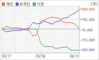 | 외국인/개인 순매수, 기관은 순매도(한달누적) 4월6일부터 전일까지 외국인이 6거래일 연속 동종목을 사들였다. 4주간을 기준으로 보면 외국인이 초반에 동종목을 순매수한 이후에 기세를 이어가며 308,946주를 순매수했고, 개인들도 매기를 떨어뜨리면서도 16,921주를 순매수했다. 하지만 기관은 매도 관점으로 접근하면서 325,867주를 순매도했다. |