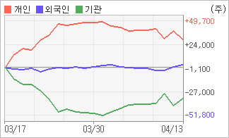 | 외국인/개인 순매수, 기관은 순매도(한달누적) 4월12일부터 전일까지 외국인이 2거래일 연속 순매수를 보였다. 4주간을 기준으로 보면 외국인이 초반에 동종목을 순매수한 이후에 기세를 이어가며 3,466주를 순매수했고, 개인들도 매기를 떨어뜨리면서도 30,133주를 순매수했다. 하지만 기관은 매도 우위를 보이면서 33,599주를 순매도했다. |