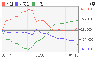 | 기관/개인 순매수, 외국인은 순매도(한달누적) 기관이 4일연속 순매수를 보이고 있는 반면에 외국인은 3일연속 순매도를 보이고 있다. 4주간을 기준으로 보면 기관이 순매도를 기록하다가 다시 순매수로 돌아서면서 201,597주를 순매수했고, 개인들도 매기를 떨어뜨리면서도 87,154주를 순매수했다. 반면 그 동안 외국인은 매도 우위를 지속하면서 288,751주를 순매도했다. |