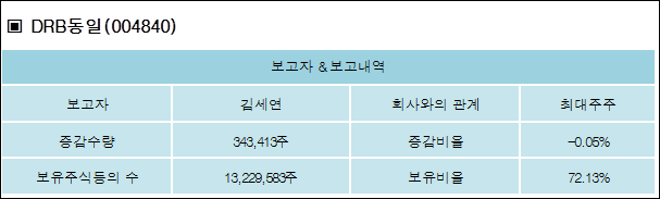 DRB동일(004840)은 14일 최대주주 김세연을 비롯한 특별관계자의 보유주식이 감소되었다고 발표했다. 이는 직전 보고일보다 343,413주 증가하여 지분율은 72.13%로 상승했다. 이번 보고 사유는 특수관계인장내매도및주식배당으로인한변동으로 알려졌다.