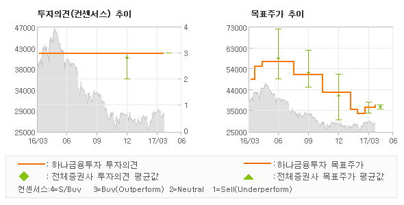 | 의견제시일자 | 증권사 | 투자의견 | 목표가 | | 20170418 | 하나금융투자 | 매수 | 37,000 | | 20170413 | 신한금융투자 | 매수(유지) | 35,000 | | 20170223 | 동부증권 | 매수(유지) | 37,000 | | 20170223 | HMC투자증권 | 매수 | 33,500 |