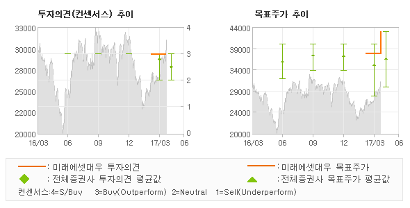 | 의견제시일자 | 증권사 | 투자의견 | 목표가 | | 20170418 | 미래에셋대우 | 매수(유지) | 43,000 | | 20170411 | 유안타증권 | HOLD(D) | 30,000 | | 20170320 | NH투자증권 | 매수(유지) | 34,000 | | 20170316 | BNK투자증권 | 매수(신규) | 40,000 |